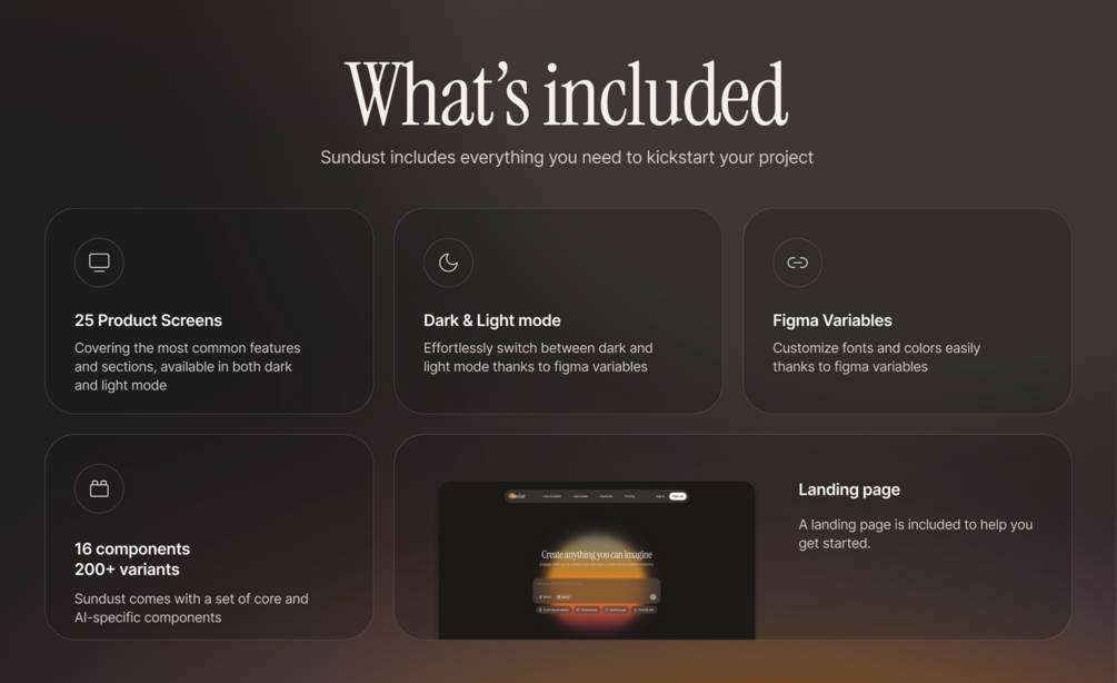 To help you launch faster, the kit also comes with a complete landing page template, including a hero section, feature highlights, and pricing.